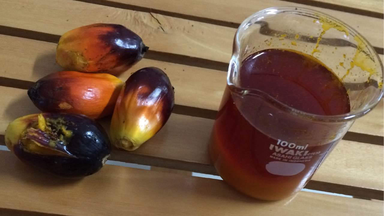 得到的毛棕櫚油參數:顏色呈橘紅色,半液體狀油,表面密度(50℃):0.8896-0.8910, 皂化值:(mgkoh/g油)190-202,碘值(gz2/100g)。